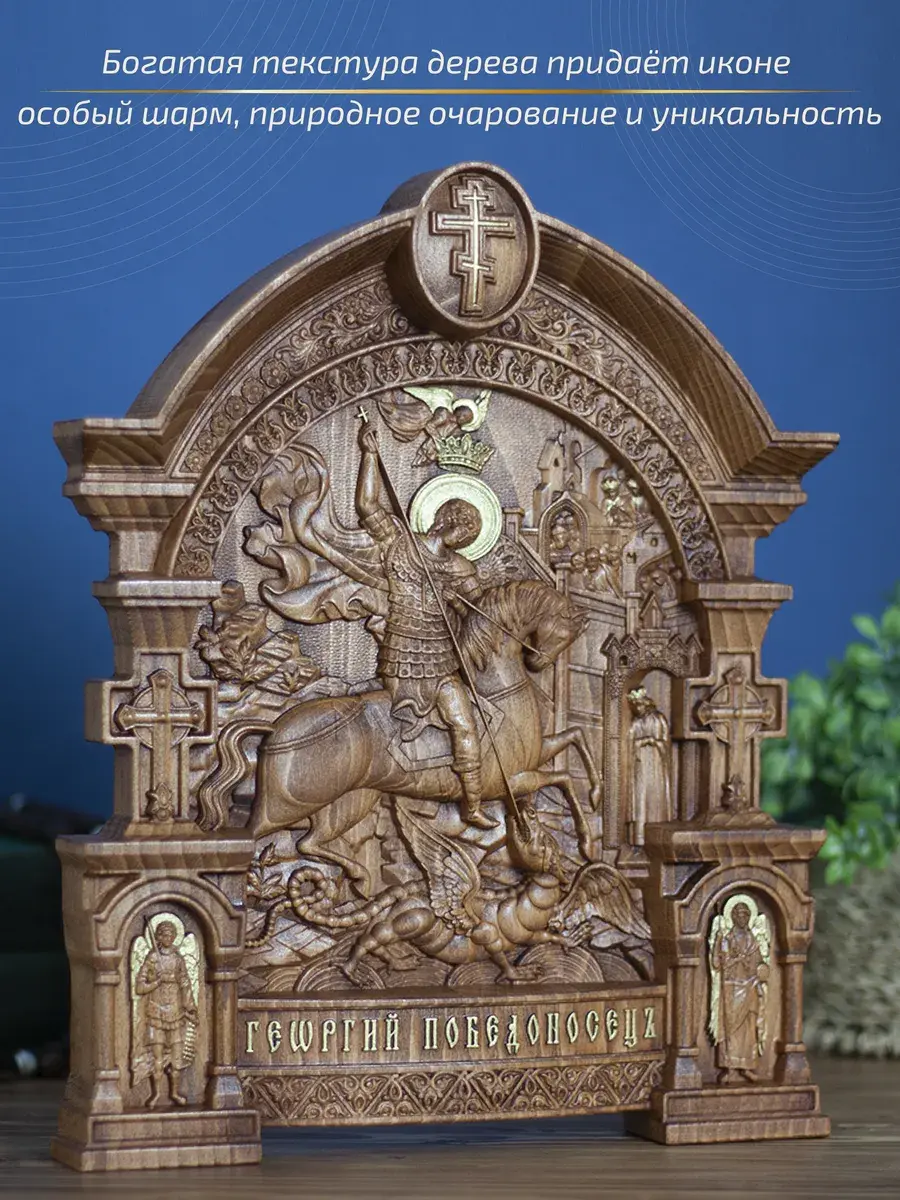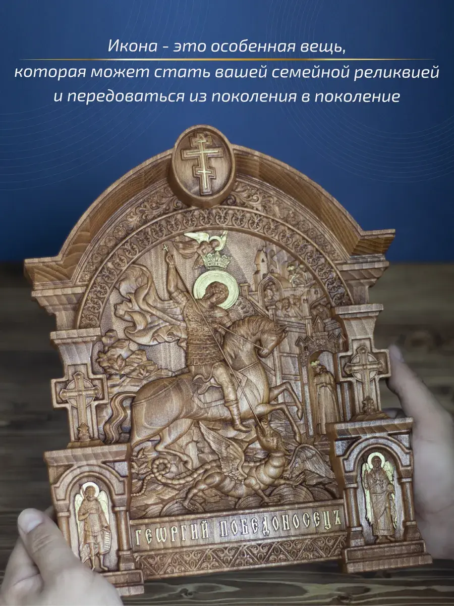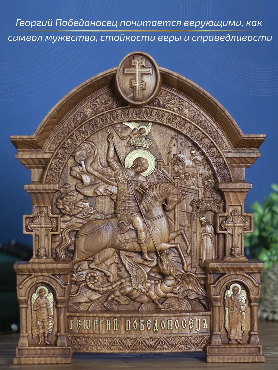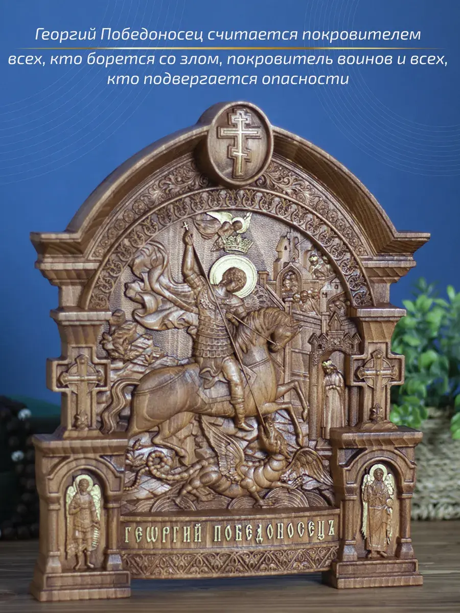 Резная икона Георгий Победоносец идеально подойдет для подарка любимым, родным и близким на любой случай жизни.