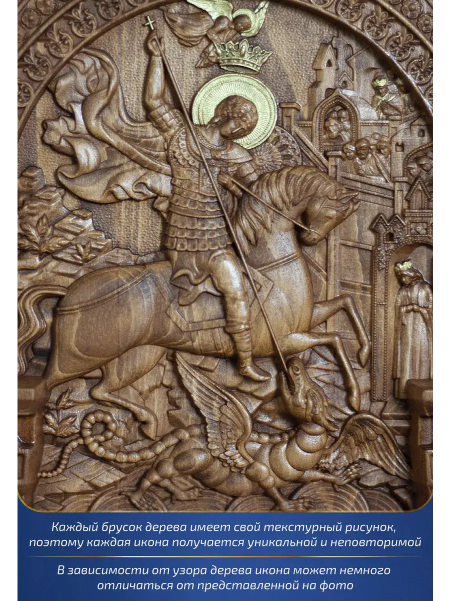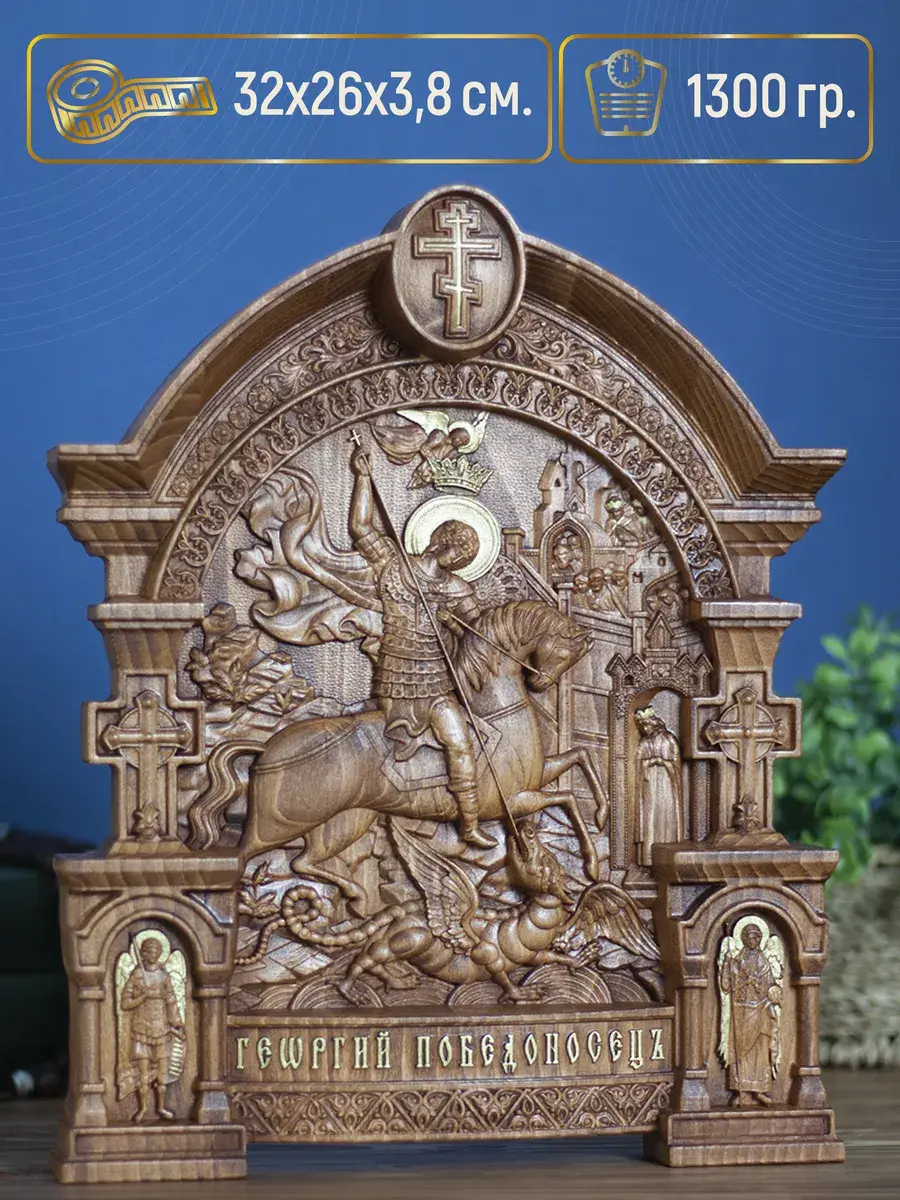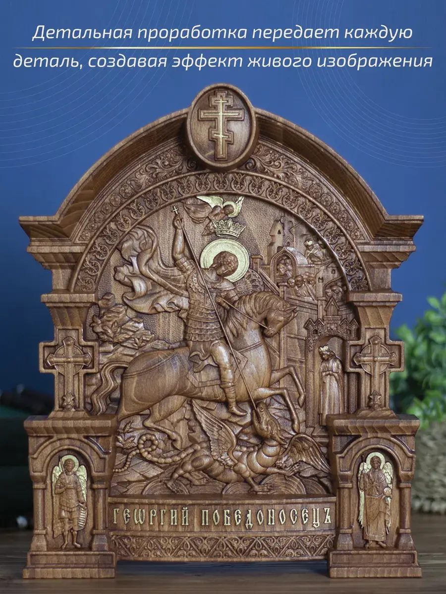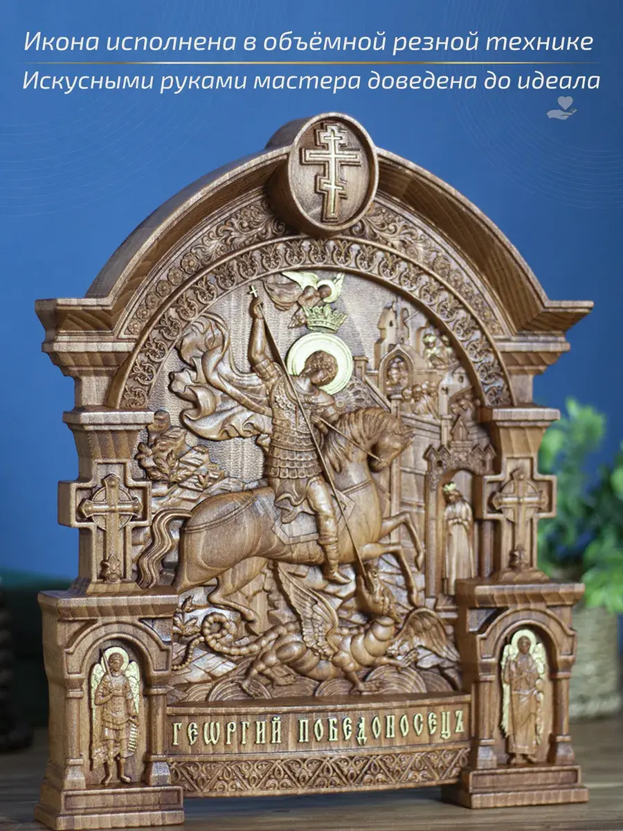 Резная икона Георгий Победоносец идеально подойдет для подарка любимым, родным и близким на любой случай жизни.