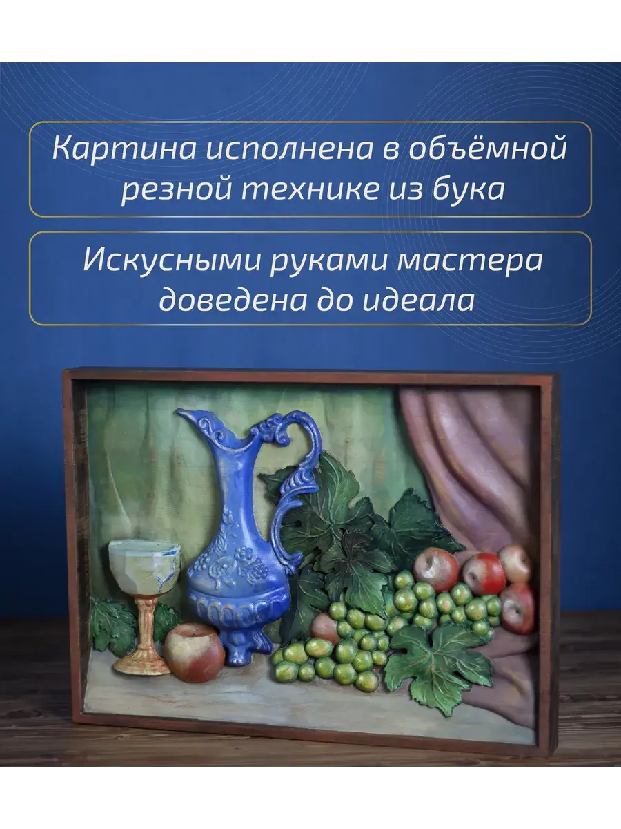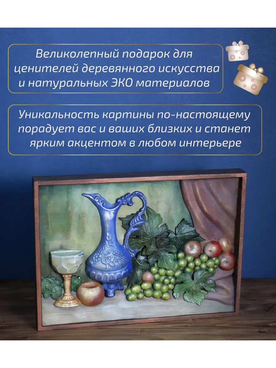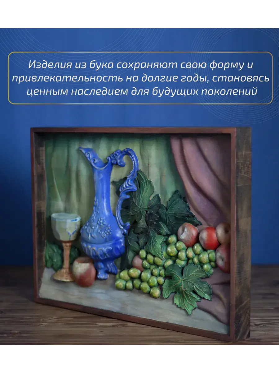 Картина изготовлена из клееного массива бука, что обеспечивает её прочность и долговечность. Объемная 3D резьба, искусно выполненная на фрезерном ЧПУ станке, создает эффект глубины и реалистичности, приковывая взгляд к каждой детали.