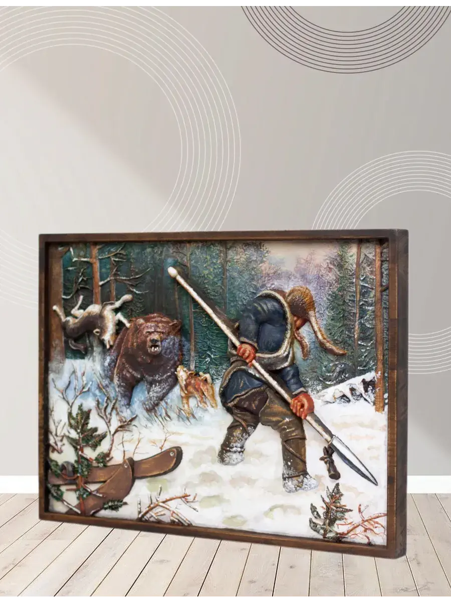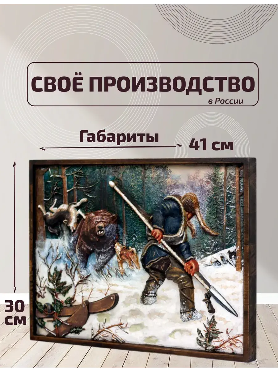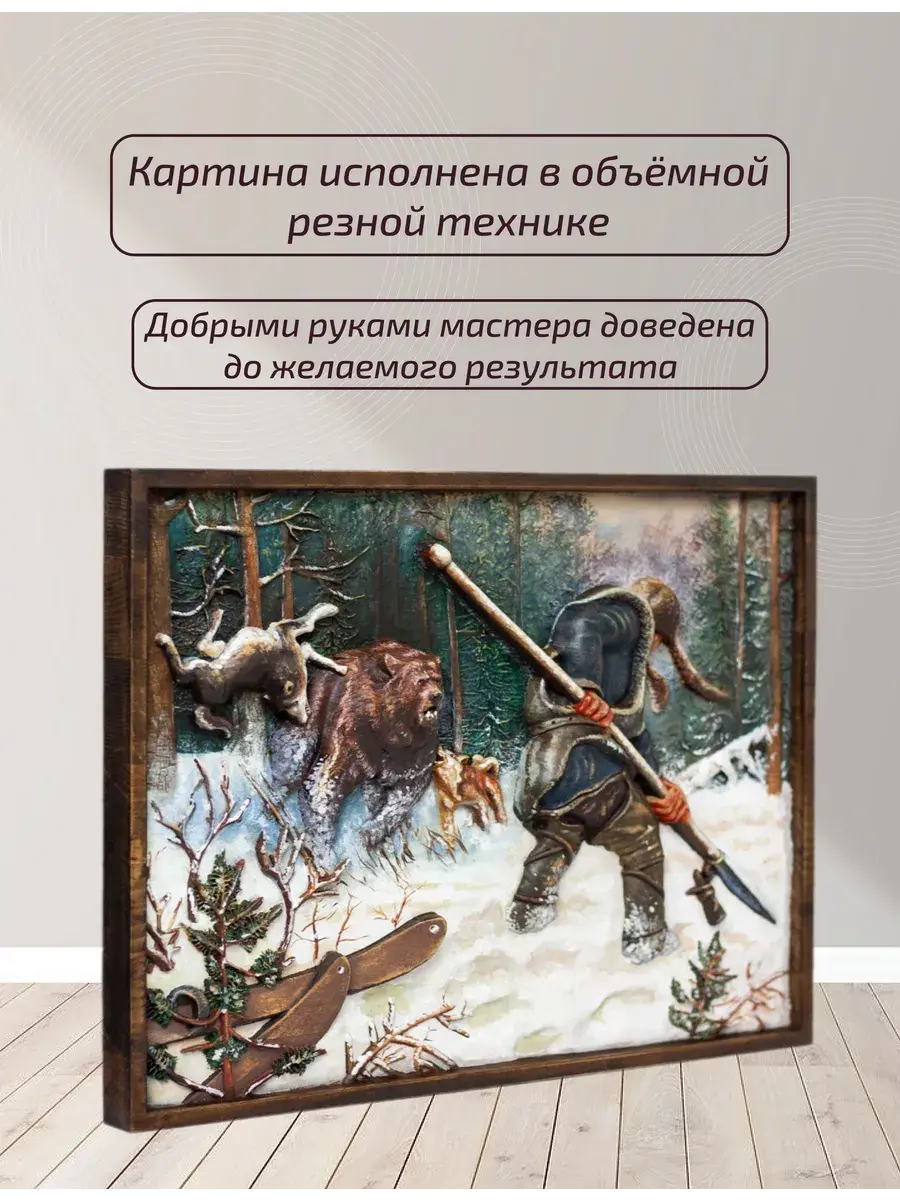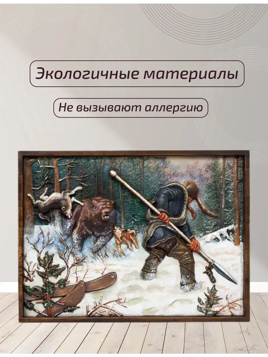 Картина изготовлена из клееного массива бука, что обеспечивает её прочность и долговечность. Объемная 3D резьба, искусно выполненная на фрезерном ЧПУ станке, создает эффект глубины и реалистичности, приковывая взгляд к каждой детали. Завершает образ кропотливая работа художника, который вручную раскрашивает картину, придавая ей неповторимый характер и живость.