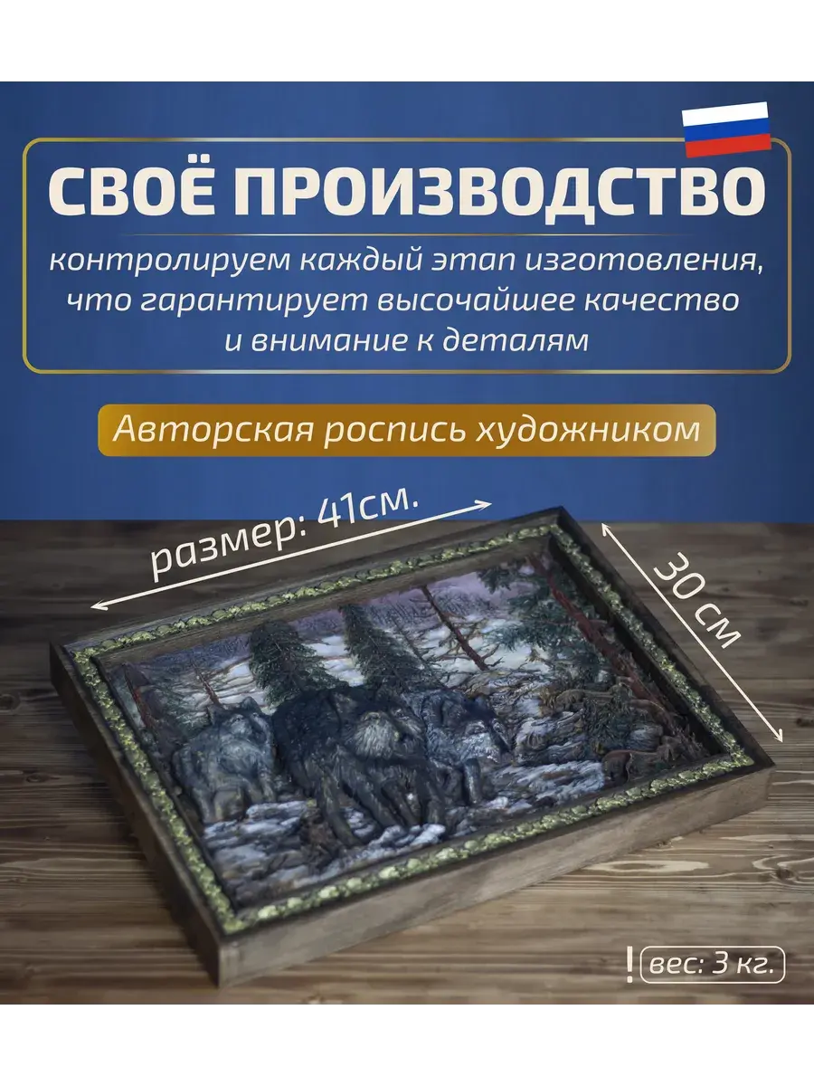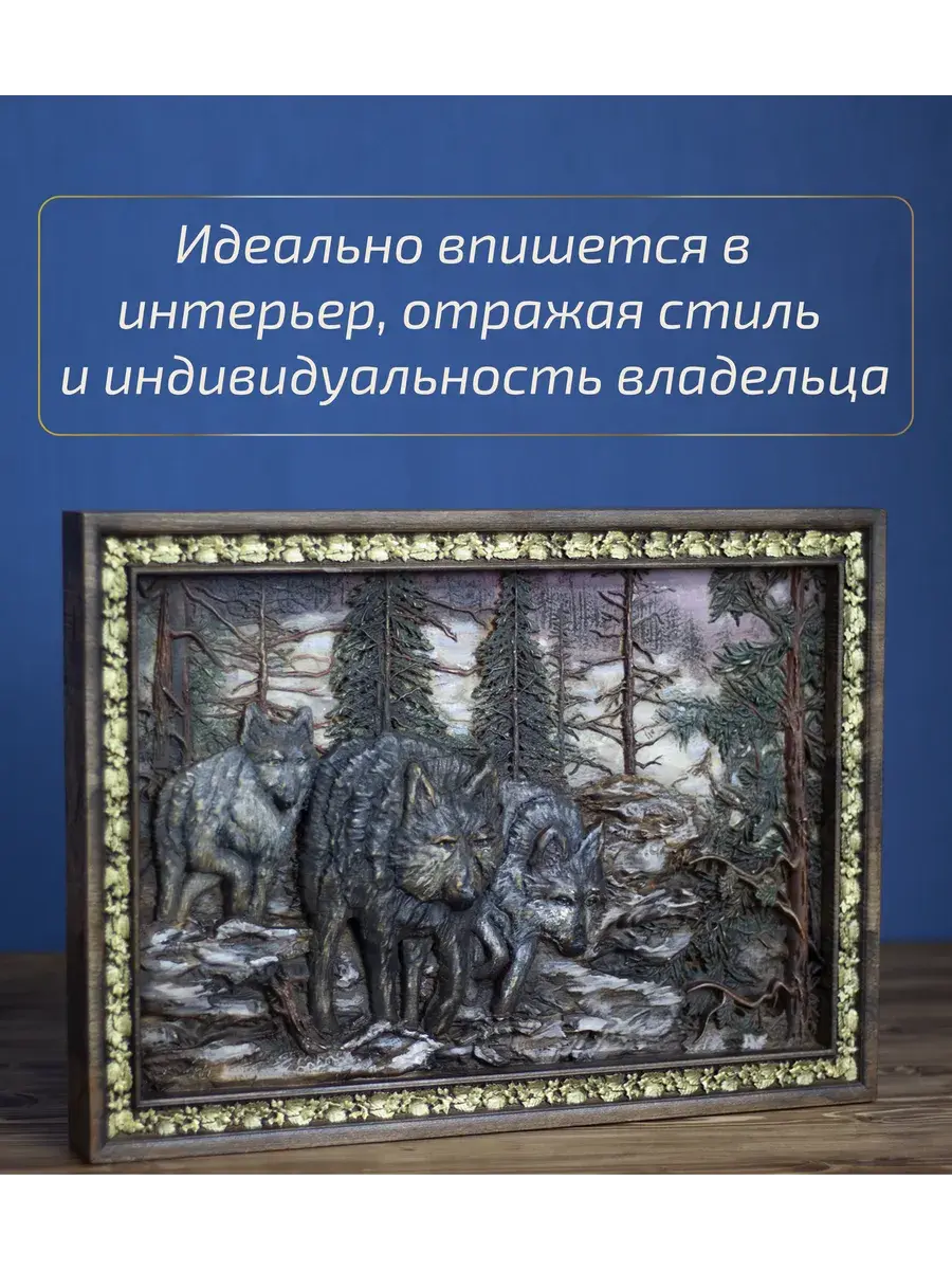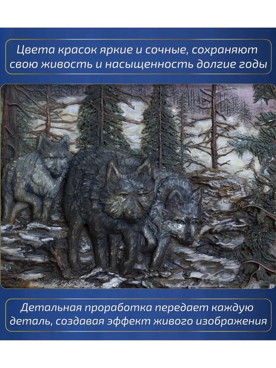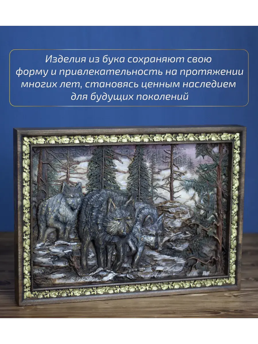 Картина изготовлена из клееного массива бука, что обеспечивает её прочность и долговечность. Объемная 3D резьба, искусно выполненная на фрезерном ЧПУ станке, создает эффект глубины и реалистичности, приковывая взгляд к каждой детали.