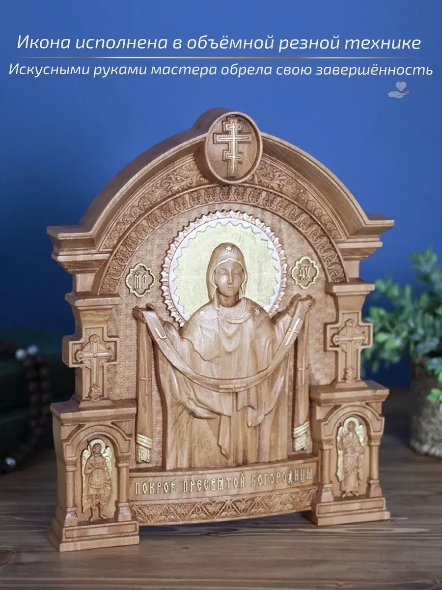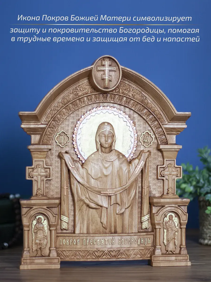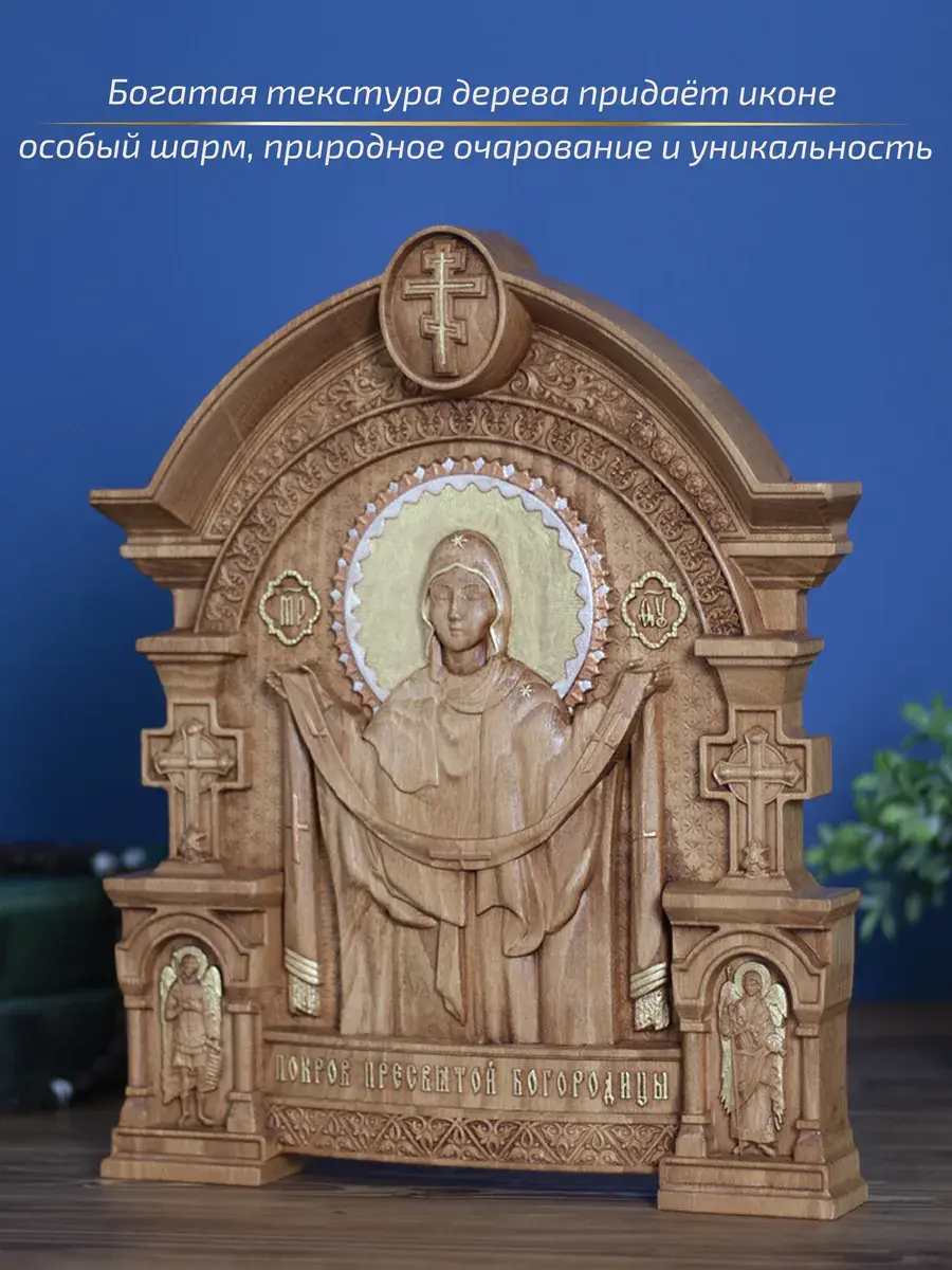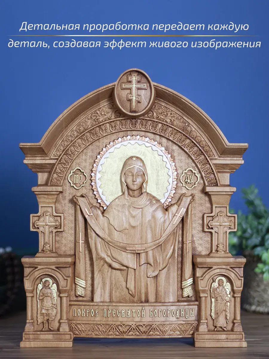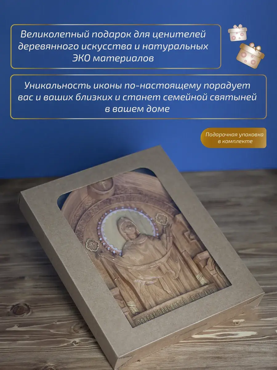 Резная икона Покров Пресвятой Богородицы идеально подойдет для подарка любимым, родным и близким на любой случай жизни.