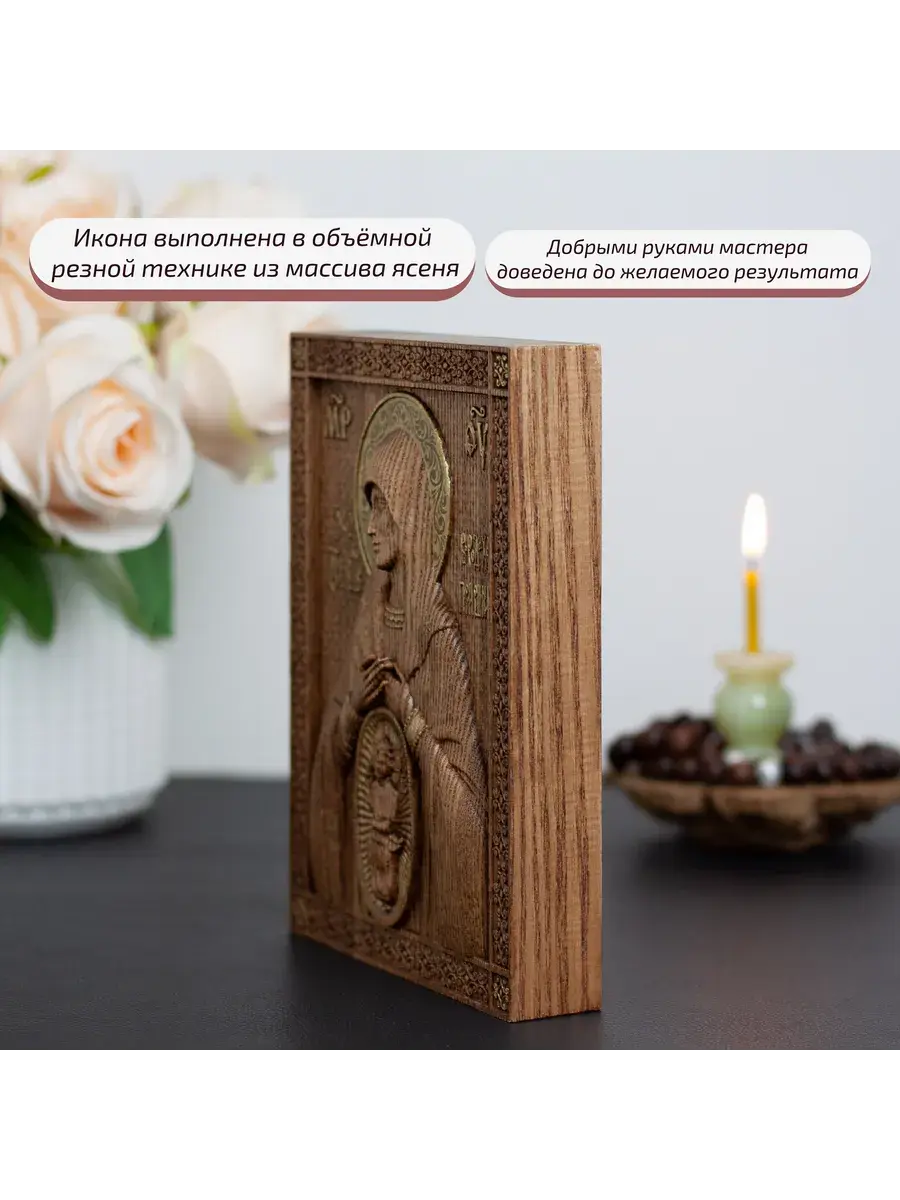 Икона изготовлена из натурального клееного массива ясень высокого качества. Резная икона из дерева выполнена на фрезерном ЧПУ станке. Икона покрыта эко лаком, он защищает дерево от влаги и насекомых, перепадов температуры, а также не вызывает аллергию и безопасен для домашнего использования. Натуральность ценных пород дерева придаёт образу уникальную и неповторимую красоту, естественность, и самобытность. Для вашего удобства на обратной стороне иконы предусмотрена петля для размещения иконы на стене.