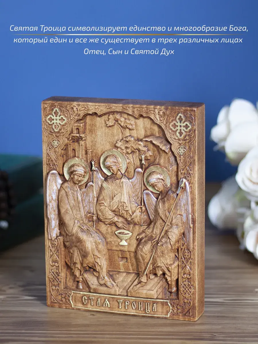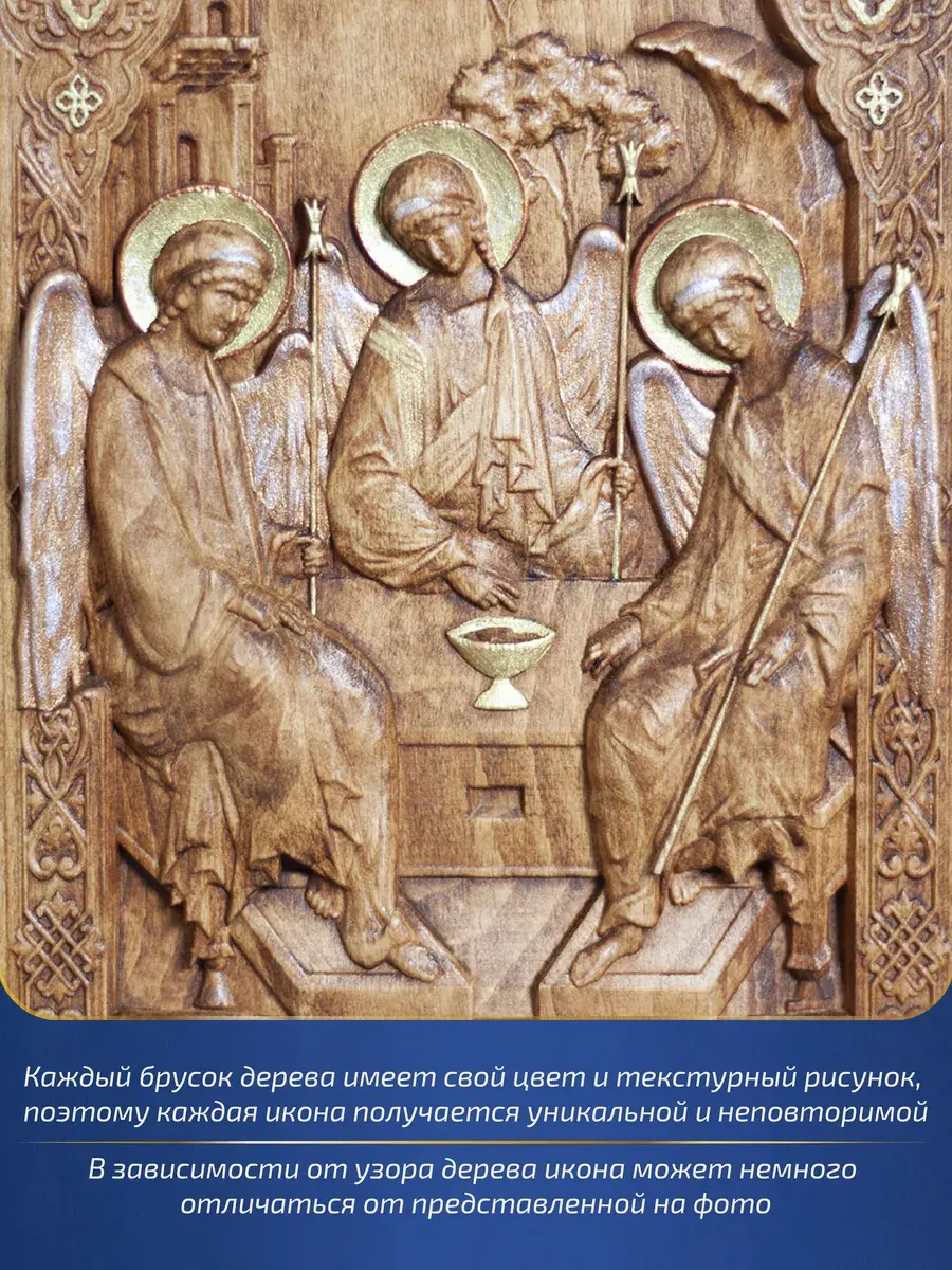 Резная икона Святая Троица идеально подойдет для подарка любимым, родным и близким на любой случай жизни.