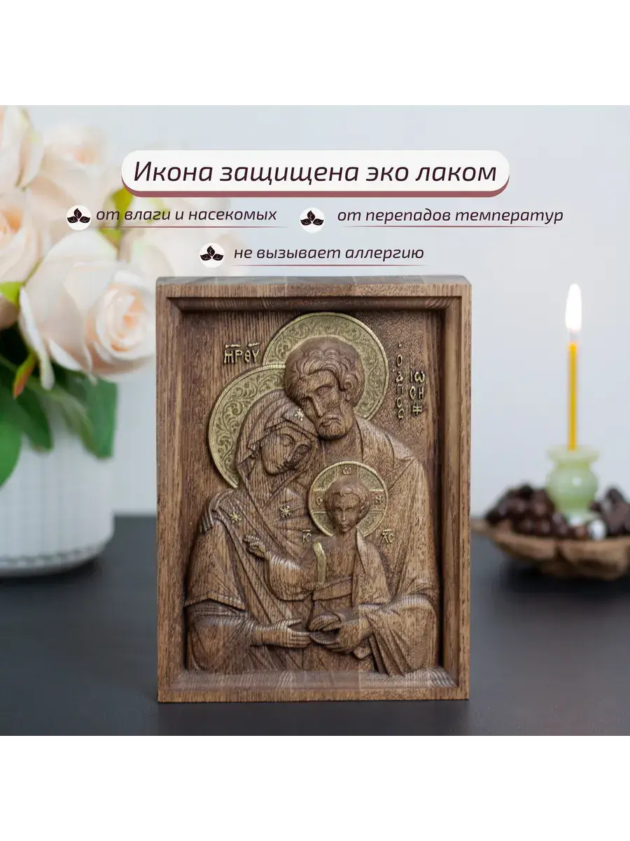 Икона изготовлена из натурального клееного массива ясеня высокого качества. Резная икона из дерева выполнена на фрезерном ЧПУ станке. Икона покрыта эко лаком, он защищает дерево от влаги и насекомых, перепадов температуры, а также не вызывает аллергию и безопасен для домашнего использования. Натуральность ценных пород дерева придаёт образу уникальную и неповторимую красоту, естественность, и самобытность. Для вашего удобства на обратной стороне иконы предусмотрена петля для размещения иконы на стене.