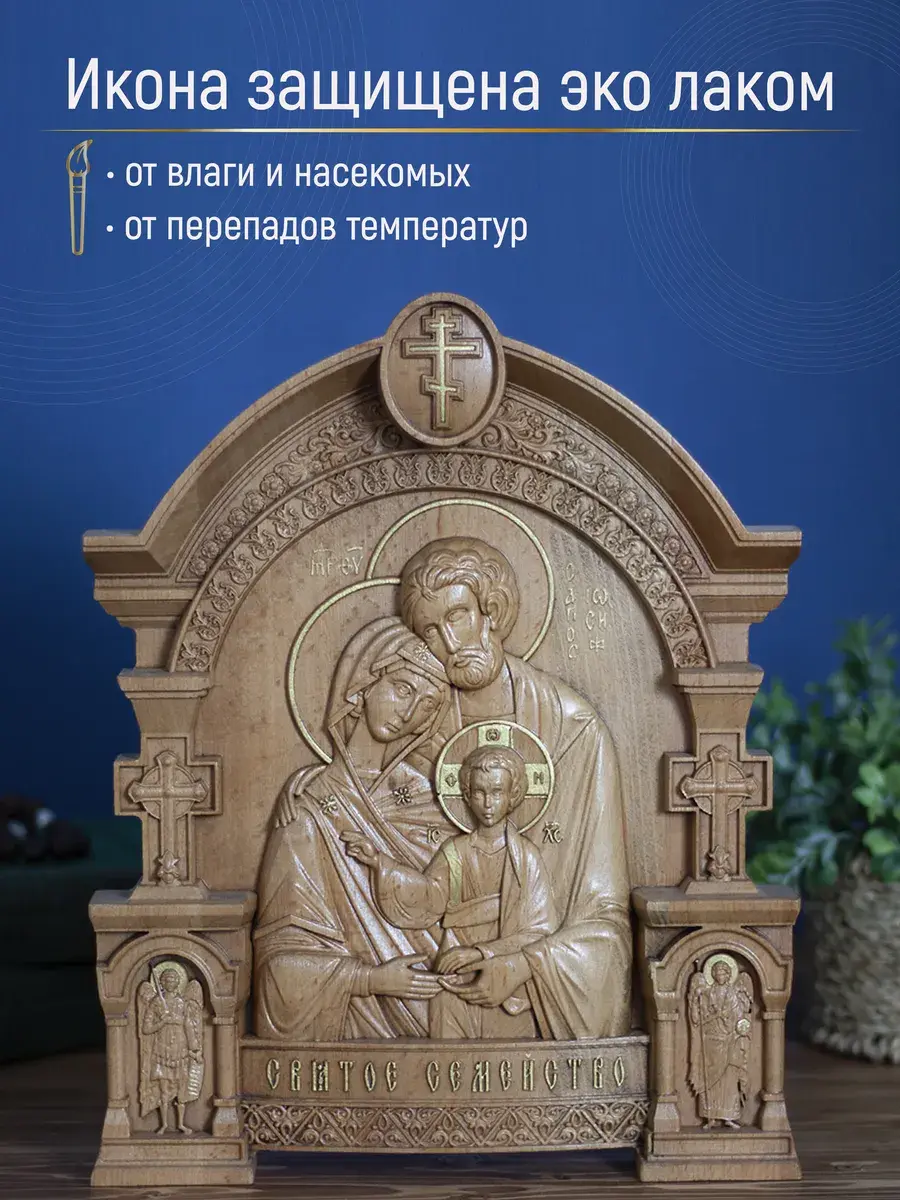 Икона изготовлена из натурального клееного массива бука высокого качества. Резная икона из дерева выполнена на фрезерном ЧПУ станке. Икона покрыта эко лаком, он защищает дерево от влаги и насекомых, перепадов температуры, а также не вызывает аллергию и безопасен для домашнего использования. Натуральность ценных пород дерева придаёт образу уникальную и неповторимую красоту, естественность, и самобытность. Для вашего удобства на обратной стороне иконы предусмотрена петля для размещения иконы на стене.