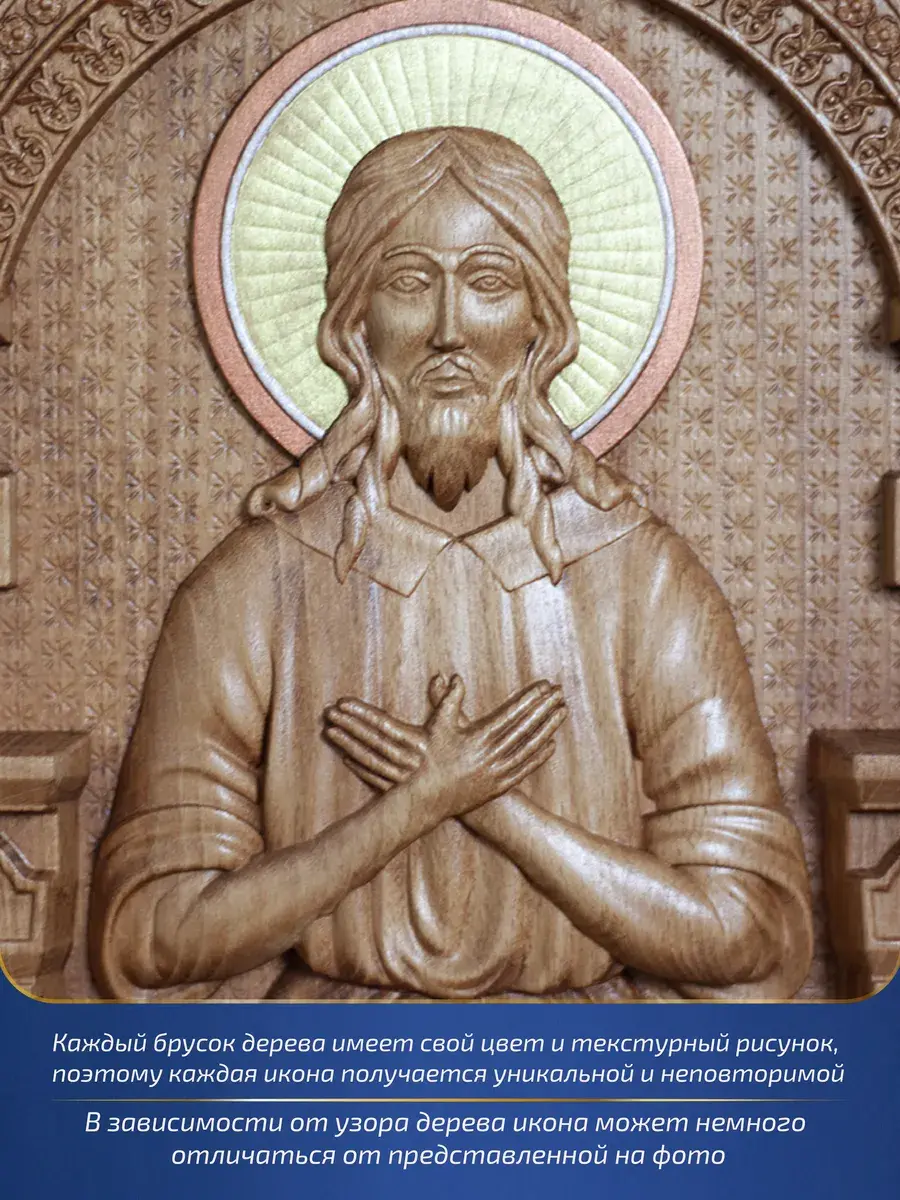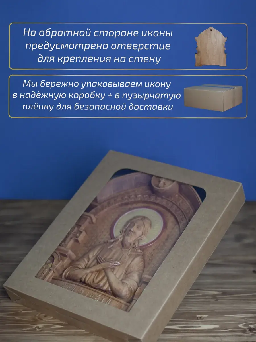Икона изготовлена из натурального клееного массива бука высокого качества. Резная икона из дерева выполнена на фрезерном ЧПУ станке. Икона покрыта эко лаком, он защищает дерево от влаги и насекомых, перепадов температуры, а также не вызывает аллергию и безопасен для домашнего использования. Натуральность ценных пород дерева придаёт образу уникальную и неповторимую красоту, естественность, и самобытность. Для вашего удобства на обратной стороне иконы предусмотрена петля для размещения иконы на стене.
