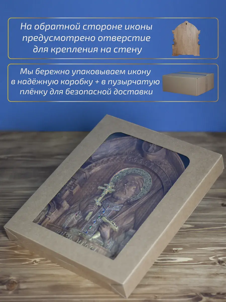 Икона изготовлена из натурального клееного массива бука высокого качества. Резная икона из дерева выполнена на фрезерном ЧПУ станке. Икона покрыта эко лаком, он защищает дерево от влаги и насекомых, перепадов температуры, а также не вызывает аллергию и безопасен для домашнего использования. Натуральность ценных пород дерева придаёт образу уникальную и неповторимую красоту, естественность, и самобытность. Для вашего удобства на обратной стороне иконы предусмотрена петля для размещения иконы на стене.