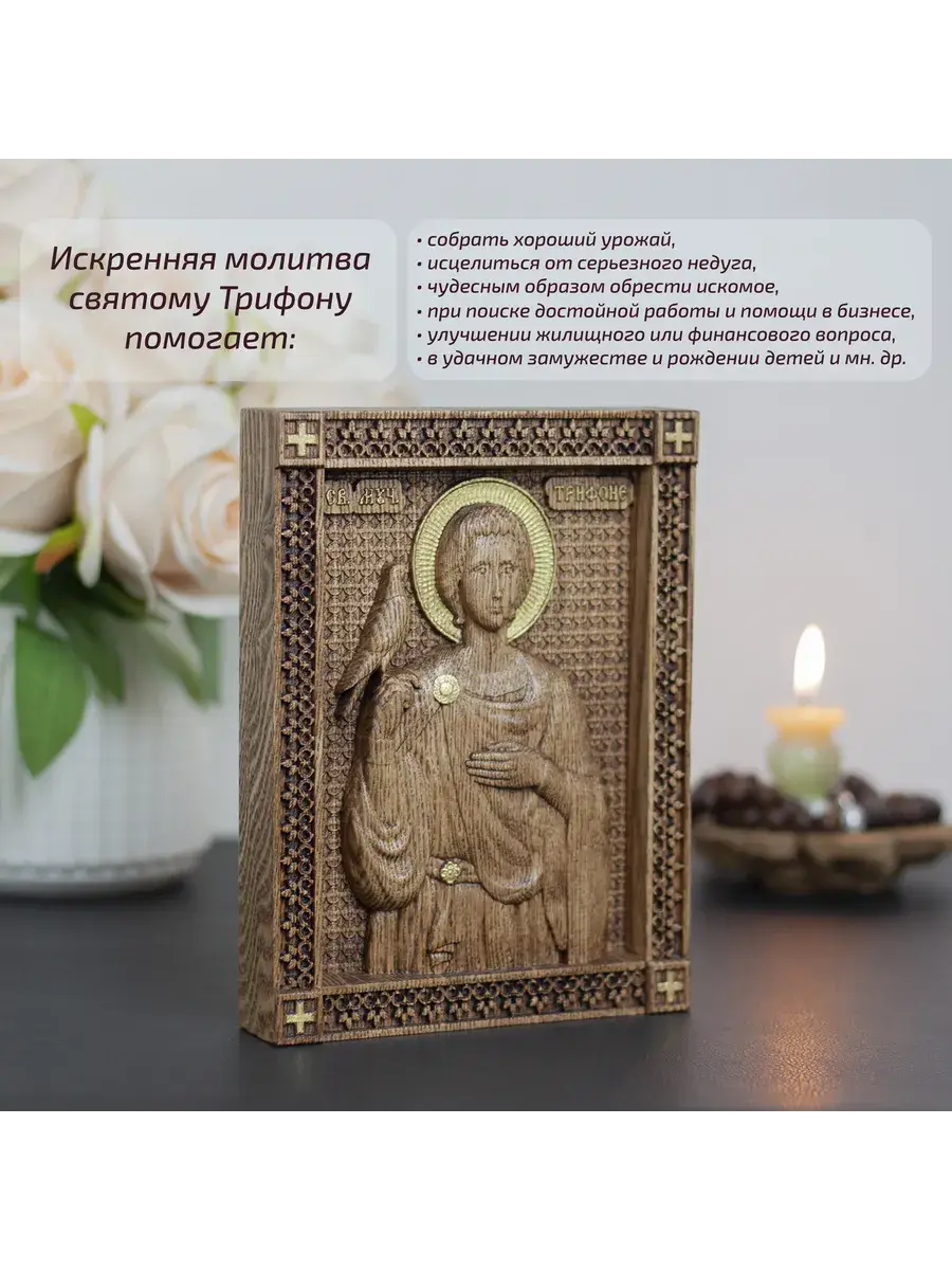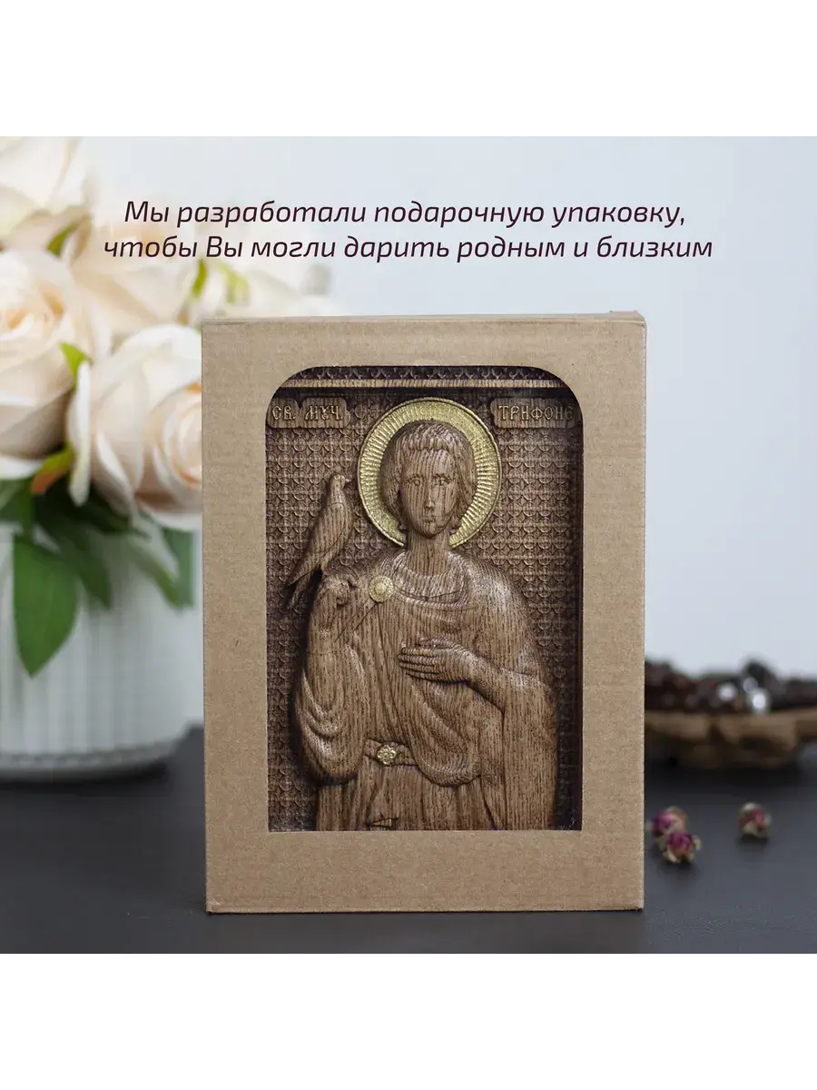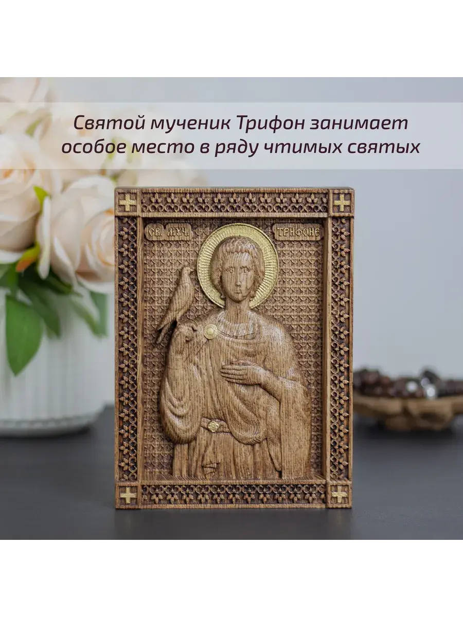 Резная икона «Святой Трифон» идеально подойдет для подарка любимым, родным и близким на любой случай жизни.